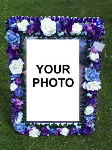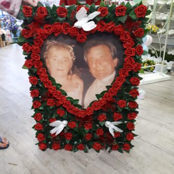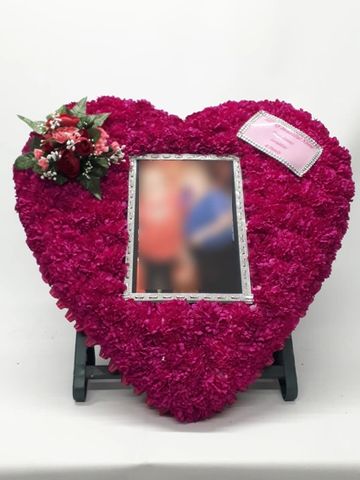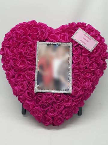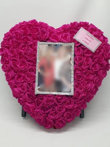 Large rose hearts on stand with photo. Artificial from £175 (approx 2ft)3ft from £250