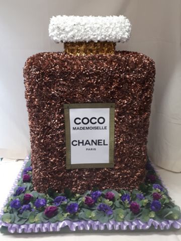 Large 3D Coco Chanel perfume bottle on flower base (approx. 3ft)